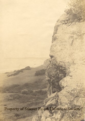 An Original print. Distance photo of Belvedere Ranch, later Stinson Ranch, near Stinson Beach School by Edgar A. Cohen. A rock in foreground, Bolinas Bay and Mesa in background. On its back: Photograph (stamped)#1820 Belvedere Ranch (penciled) Edgar A. Cohen, Alameda, Cal.(stamped) The Bolinas Beauty (penciled)