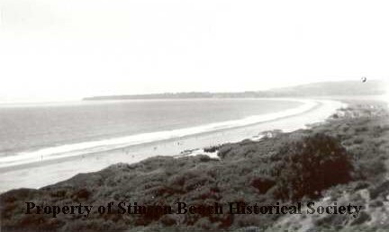 Panoramic view of Stinson Beach/Bolinas Bay looking north from high on the hillside. Some beachfront homes in the Calles are visible in the distance. Foreground is mostly thick with treetops and scrub.