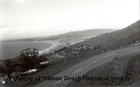 On the hill above what was White Gate Ranch overlooking Stinson Beach and Bolinas Bay. The ranch buildings are somewhat obscured by trees but houses on the hillside and in the village are quite visible, as well as a portion of Panoramic Highway above which the photo was taken. Low clouds hover above the skyline.