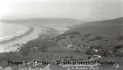 Panoramic view of Stinson Beach Village similar to previous photo (1999-278) but from a higher elevation and with more detail noted. Written at the bottom in white ink with arrows identifying the landmarks are: Dispsea Trail, Auto Road and Willow Camp. The houses on the hill are more distinct and more of the Lagoon is visible.