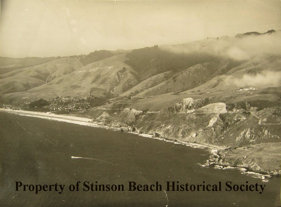 An aerial photograph in black and white. A photograph of the Stinson Beach coastline to the cottages at the Steep Ravine and the hills behind taken from air. Shows the town of Stinson Beach, Stinson Beach, Highway 1 and the rocky shore below, the cottages at Steep Ravine in the lower right. The Pacific in front, light fog rests on the hills. On the back of the photo stamped: Fred Mae Aero Photos. For Additional Copies of this Photo Refer to Neg. No. 11.