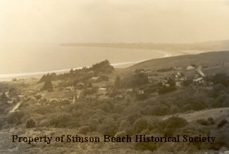 Vintage sepia-toned photo of panoramic view of Stinson Beach/Bolinas Bay from the scrubby hillside. Only a scattering of houses dot the hillside and most are separate from each other or surrounded by trees