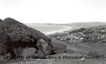 This is a panoramic shot looking down on Bolinas Bay. It shows many homes in the village and several buildings along the beach. With the Bolinas Peninsula in the distance, it defines the contour of Bolinas Bay.