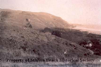 View of Bolinas Bay looking southward is mostly grassy hillside sloping toward the sea. Somewhat barren