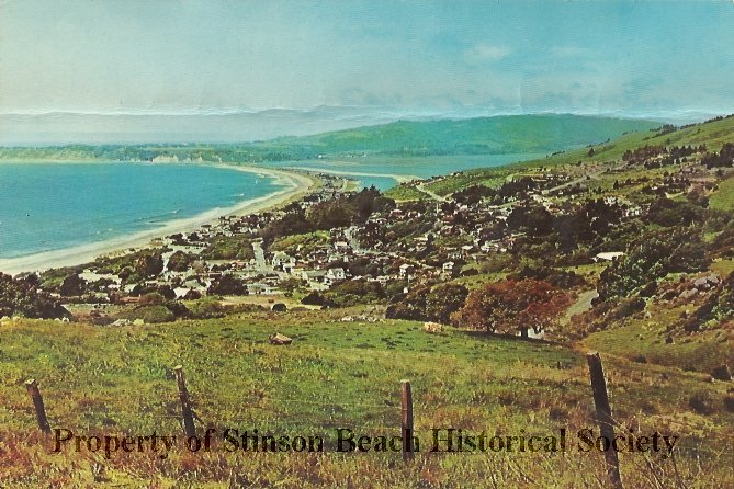 Color postcard of panoramic view of Stinson Beach taken from White Gate Ranch with fence posts in front. The mainstreet of town in is the just to the right of center in the picture. Seadrift ,Bolinas Lagoon and the hills behind Bolinas are in the distance. It is a beautiful sunny day.