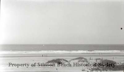Looking at the ocean past vegetation-covered sand dunes. Photo seems to be taken from the end of a boardwalk visible in the left-hand corner.