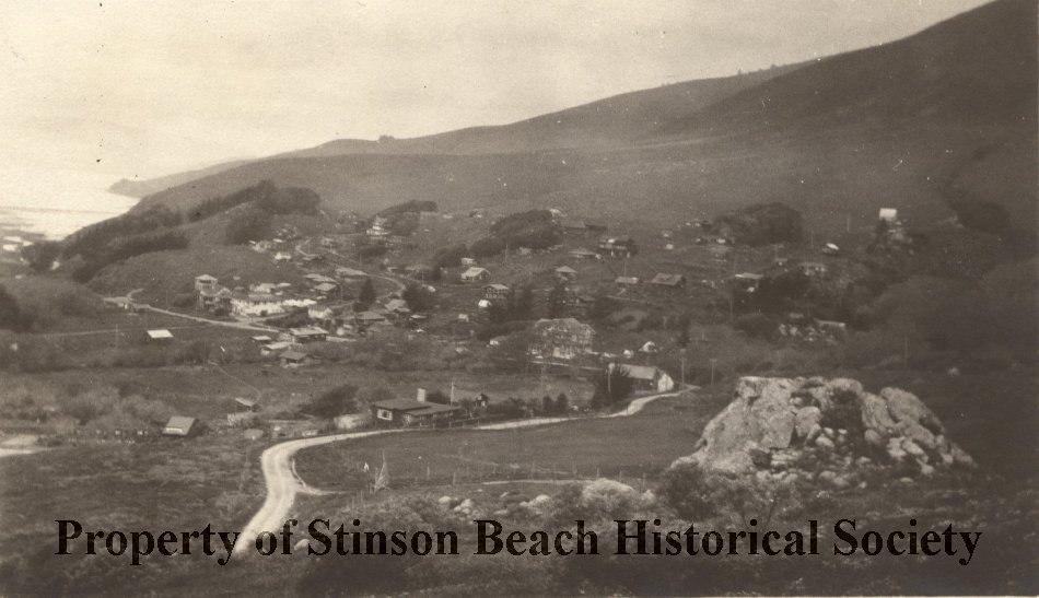 A black and white panoramic view of a barren hillside with the ribbon of a road winding northwest (Highway 1) through the lower elevation where homes are scattered on the landscape. Part of the Bolinas Lagoon and of the Bolinas headlands show in the upper left hand corner of the photograph. There is a large rock in the lower left side of the picture in the foreground.