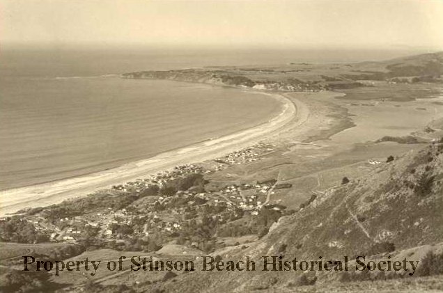 The photograph shows all the neighborhoods of Stinson Beach: downtown, the calles, the patios and the highlands. At the time there was no Seadrift development.
