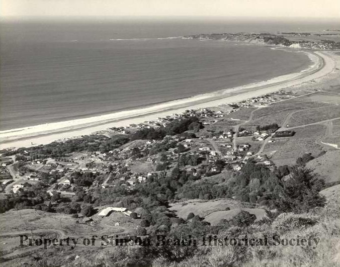 This original black and white photographic print shows the sweep of Bolinas Bay from the south portion of Stinson Beach town all the way around to the tip of Bolinas Point. At the center top of the photo is the white water showing the position of Duxbury Reef and at the far right can be seen the Bolinas Mesa. In the center foreground is the town of Stinson Beach with the calles and patios and a few houses on the sand spit along the beach. Back toward the hills (and the camera which is high on a hill overlooking the town) is the rest of Stinson Beach including Old Town and the Highlands.