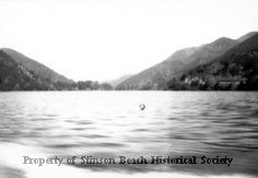 This balck and white photograph is taken from a boat looking across an expanse of water to the shore beyond. There is something on the wqter at the center of the photo. It could be a buoy or an artifact.