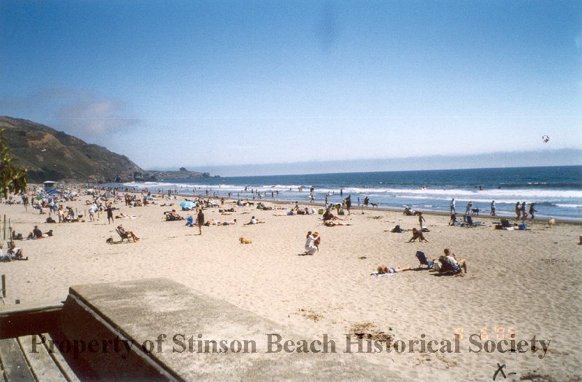 Color photo of Stinson Beach on a lovely sunny day with many sunbathers. The lifeguard shack is in the left middle of the photo. You are looking toward south with the cliffs in the rear of the photo.