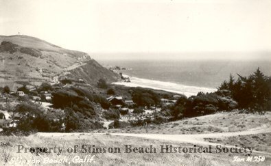 B&W postcard view from above of the Stinson Beach hillside with houses built on the ridges and sloping down towards the beach, culminating in the Pacific Ocean surf. A dirt roadway runs along the cliffside and on the foreground property. Written on the back of the photo in ink is: "View from 415 Calle del Mar when land was purchased - approx 1953. KH Finley." Also written in pencil is "January." The front of the postcard identifies, in white, the scene as Stinson Beach, Calif. Also in white in the right hand corner Zan M 250.