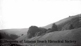 View from the ridge above Stinson Beach of a barely visible Bolinas Bay. Mostly we see sloping hills with a copse of trees.