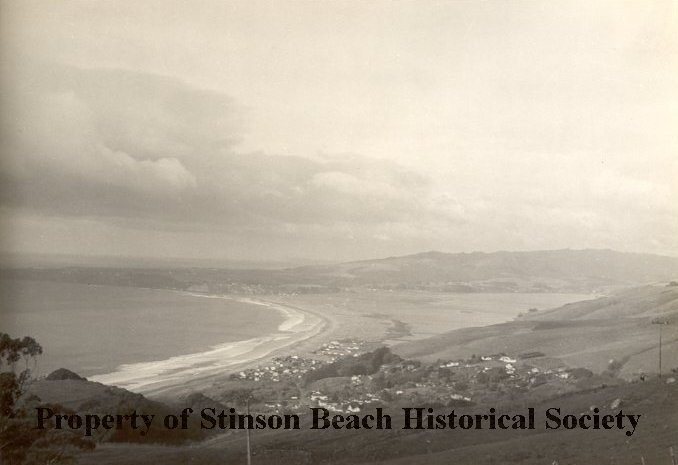 In this black and white photographic print we see a panoramic view of Stinson beach and Bolinas Bay. The Pacific Ocean is on the left and the town is in the foreground. Behind the town is the Bolinas Lagoon with Bolinas Ridge and Bolinas Point stretching across the horizon. There are cloud formations over the bay.
