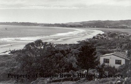 This black and white photo shows the hoses of Stinson beach in 1950s showing on very front, the Smith's house which stands on just south of Highway 1 and Panoramic Highway junction, which was probably the south end development of Stinson Beach at the time, and houses on the beach beyond. The sandspit without houses and Bolinas ridge and the sweep of the beach and sky continues the composition of the photo.