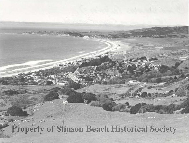 This black and white photograph shows a panoramic view of the town of Stinson Beach and Bolinas Bay. Photo taken from Panoramic Highway. The first houses of Seadrift Subdivision are at top of photo: Adelaide Mc Cready, Admiral King, and Wayne & Mabel Jeffers. The Hubbard house on Panoramic Highway is in the foreground.