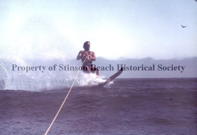 Peter B. Allen waterskiing in 1960, bare-chested and bronzed by the sun. He holds the tow rope with 2 hands, a spray of water behind him, a fog bank on the horizon, one seagull in the sky. He appears to be on one ski and its toe end is raised diagonally out of the water creating a dense white spray.