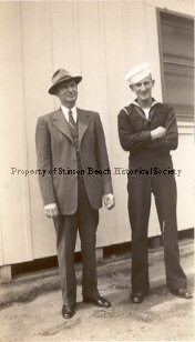 Will Airey (father) stands beside his son Robert in front of a white sidewall of a building with a small closed and shaded window on the right. Will (L.) is dressed in business suit and tie with brimmed hat, hands at his side, and Robert (R.) is in a Navy sailor's uniform with arms folded across his chest.