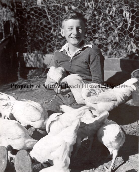 A boy, Robert Airey, seated on the dirt against a fence, has a broad smile on his face as he is surrounded with seven white chickens. He wears a thin dark colored zip front pullover and a light collared shirt. His well worn shoes protrude from under the chickens at the lower left corner of the photograph.
