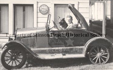 Robert Airey sits in a circa 1915 car with a large German shepard in front of the Sea Beach Hotel. The top of the car is halfway down and the sides read in large painted letters S.B.F.D. and Pol. Dept. in smaller etched letters next to a painted star. Along the bottom is painted "Welcome, Babe." A circular sign on the wall of the building reads: Meeting Hall Progressive Club of Stinson Beach. This photo is printed on postcard paper and the back shows that it was mailed from San Francisco on Jan. 20, 1955. It is addressed to Mrs. Robert Airey and just says "Welcome, Babe"