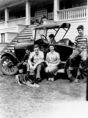 The 3 children on the running board are from left to right Dan Woodington, Robert Airey and Irma Avilla. The boy on the rear fender is Ken Mayers. The boy inside the car is George Avilla. The man on the veranda is Bill Airey. The dog is the Airey's dog Tawney. The building is the old Sea Beach Hotel (now destroyed by fire) owned by the Airey's (see #1993-204-02).