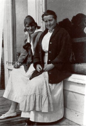 A photo of two women sitting on the ledge of the front window of a building. The woman closest to the camera is wearing a checkered apron. The women are Marge and Elizabeth Airey and they are sitting in front of the Airey Hotel, Stinson Beach CA.