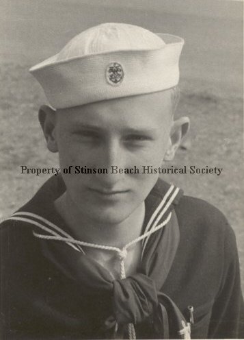 A young man, Robert Airey, in his seaman's uniform, photographed from above and visible from the chest up. He wear the traditional sailor hat and has a dark middy top. Faint penciling on the back of the photograph says 1941. Robert has a very short haircut, no sideburns, is squinting against the sun and has a faint smile. An unidentified object protrudes from his left pocket.