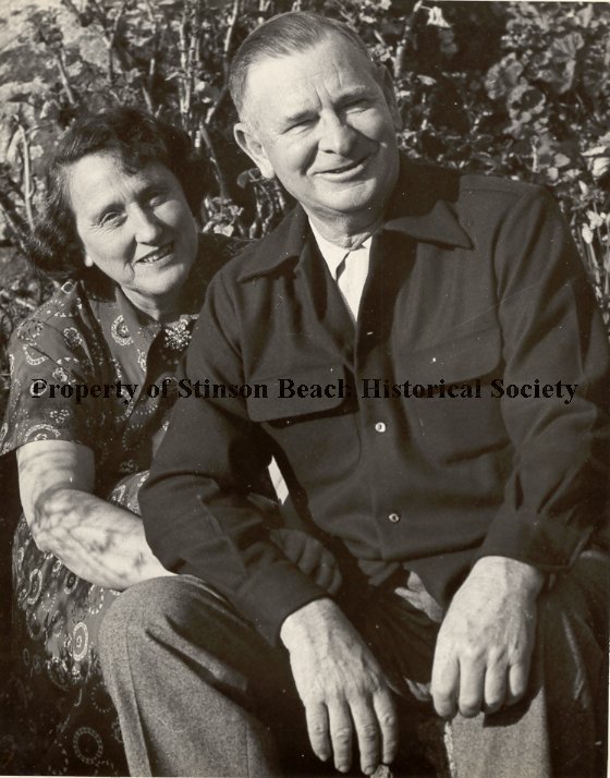 An original black and white photograph of Louise and Will Airey taken 1953. Louise was a Stinson Beach School Teacher, Will was the first Fire Chief during and after the completion of the Firehouse in1949. Both were instrumental in the development of the Community Center Complex. They owned and operated the Sea Beach Hotel which served as Community Center and Church as well as a tourist facility. See notes.