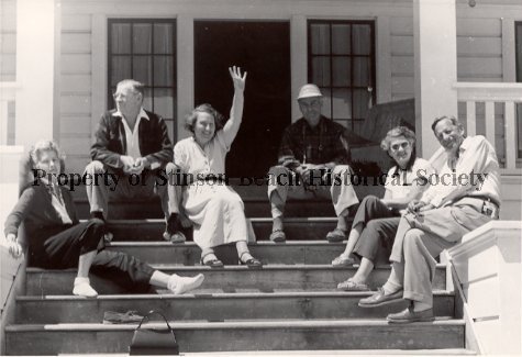 On the steps of the Sea Beach Hotel six people are lounging in the sun. There is a strong family resemblance. On the top step on the left sits Will Airey and to his right Louise, his wife, with her arm raised in a greeting. To her right is a man wearing a cap. Sitting on the ledge of the porch is a woman and a man and opposite them a younger woman with fair hair. All appear more dressed up than is usual in such pictures at the beach, the men with slacks and open collared shirts. The younger woman has kicked off her shoes and a handbag is sitting in the foreground.
