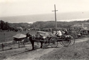 In this black and white photo several people are in a horse drawn buckboard. The driver is Frank Airey. The man in the white hat is Robbie Dunn. Airey Hotel, now the store, is behind to the right.