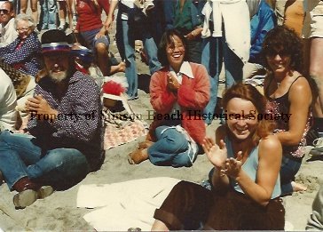 Tamae Agnoli and Gino Skye sit on the beach in Bolinas with a crowd of people -- the only recognizable face is Annie Crotts sitting a short distance behind Gino -- on what is presumably the 4th of July. They seems to be clapping - possibly for the Stinson Beach side in the annual tug of war. Gino wears a dark shirt with white dots and a black brimmed hat with red, white & blue band; Tamae has on a red jacket, white shirt and jeans.