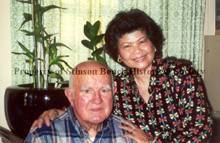 In this color photograph a man (Hal Airey) and a woman (Oy Airey, his wife) smile into the camera. He is a white haired, balding man wearing a blue plaid shirt. She is a dark haired Asian woman wearing a print blouse that has red and tan bows on a black background. There is a black bowl with a houseplant behind them and a green and white print curtain behind that. Hal is the son of Frank and Marge Airey, grandson of Harry and Elizabeth Airey, who started the Airey Hotel/Airey Store at the corner of Highway 1 and Calle del Mar in 1908 moving from San Francisco after 1906 erthquake. This series of photographs were taken by Sally Veauta on the occasion of her oral history visit to Hal.