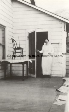 A black and white photograph of Elizabeth Airey standing by a doorway of the Airey Hotel. There is a table with a table cloth with a chair standing on top of it. Elizabeth is wearing a floor length dress and apron.