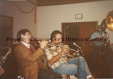 Kendrick, in brown sports jacket, plays the trombone next to Ben, in beige & white sport shirt, plays the trumpet. The tuba player in the background is unidentified.