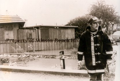 Fire Chief Kendrick Rand, in his SBVFD slicker and cap, stands on the bridge over Easkoot Creek where the water has risen to the floor of the house behind him (the old Elwoods?).