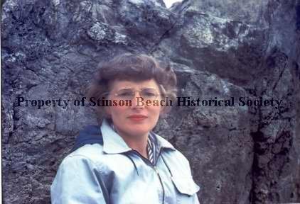 This color photograph is of a young woman from the chest up. She has short brown hair and is wearing glasses. She faces the camera unsmiling in a light blue hooded jacket. There is a rocky wall behind her. She is Joan Castledine Reutinger.
