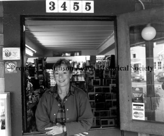 This black and white photo is of a woman (Annie Rand, proprieter) standing at the door of a bookstore. She is leaning on the lower half of a Dutch door smiling. There are address tiles above the door with the number 3455. Behind the woman, inside the bookstore, bookshelves and card racks can be seen.