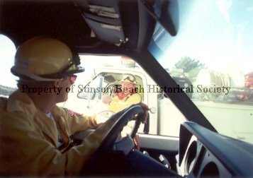 A color photographic print of Kendrick Rand sitting inside of a fire truck with one hand on the side window rail and his right hand on the steering wheel. We see the back of his head as he talks to Pat Norton who is driving another fire truck going in the opposite direction.