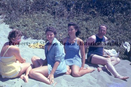 Four people (3 women and one man) sit on the sand in front the the dune grass. From l. to r. are Joan Castledine (Reutinger) in a yellow and white swimsuit with skirt, Peggy Pepper wearing a blue denim shirt over a black bathing suit, an unidentified woman in a blue polka dot swimsuit, and Edwin Castledine in a blue tank with matching swim shorts. He also is wearing glasses.