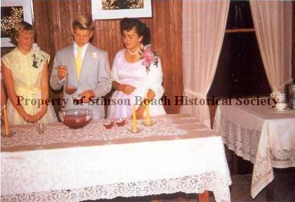 This color photograph is of three young people standing behind a table covered by a lace table cloth with a glass punch bowl and candles on it. On the left side is a girl (Diane Smith) in a pale yellow dress and a corsage of white flowers. On the right is a girl (Deanna McKennon) in a white dress with a pink corsage. Between the girls is a boy (Richard Reasoner) in a pale grey suit and yellow tie ladling punch into a punch cup. Both girls are watching the process as is the boy. There is a wood panel wall behind them with two pictures hanging and a window with curtains to the right with part of another table visible also with a lace cloth.