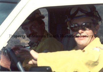 A color photographic print of Kendrick Rand in the driver's seat of the fire truck facing the camera and smiling. He is wearing the yellow firemen's uniform and hard hat. He has a pair of dark sun glasses on and a dark pair of firemen's goggles is on his hard hat. On the passenger seat out of the sun, Kenny Stevens is sitting and looking at the camera.