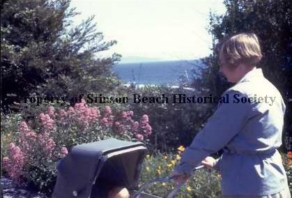 This color photograph is of a woman with short brown hair and wearing a blue jacket. She is pushing a baby buggy. The lower portions of the buggy and the woman are cut off so just the top of the baby's head and the woman from the hips up are visible. There are pink flowers growing behind the buggy and some yellow flowers also. There are trees at either side of the photo framing a view of the ocean in the background. The woman is Joan Reutinger and the baby is her son Martin.