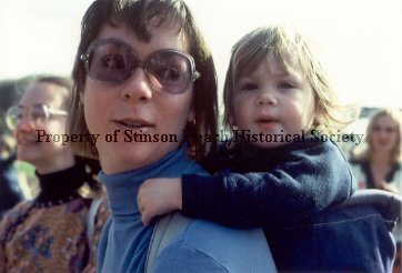 Close-up of Anne Rand wearing large sunglasses, dressed in a blue turtleneck, attending the Stinson Beach School dedication with Carlisle in a carryall on her back. Lorelei can be seen behind them.