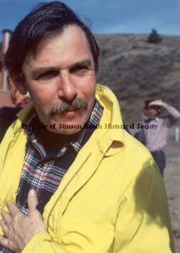 Kendrick Rand at the Stinson Beach School Dedication. He sports a moustache, yellow windbreaker over a blue and red plaid shirt and is holding his hand to the center of his chest.