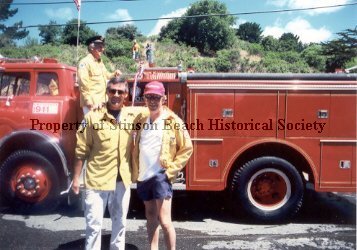 Kevin Hicks (L) and Kendrick Rand (R) stand shoulder to shoulder in front of a shiny red fire truck. Kendrick is wearing blue shorts, white shirt and yellow windbreaker. Kevin also has on a yellow FD-issue windbreaker and white chinos. Elderly man in a captain's hat stands on the fire truck behind them. Hikers/spectators can be seen coming down the hill behind them. It is the 4th of July in Bolinas.
