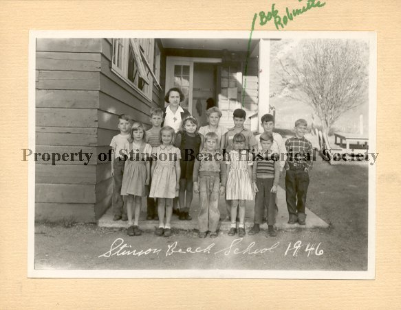 Black & White photograph of the 1946 class of the Stinson Beach School. 12 children in two rows and their teacher. Identified children are as follows: 3rd from the left in the front row is Barbara Smith; first on the right in the front row is Tom O'Gorman; third from the right in the back row is Bob Robinetti. The teacher is Louise Airey.
