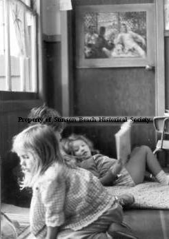 This black and white photo is of three children on the floor. The girl in the foreground (Suzannah Staples) is on her hands and knees. Behind her and mostly obscured by her is another child and beyond these two is a girl lying on a mat looking at a book.