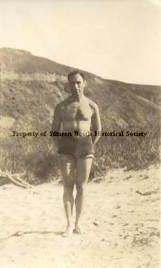 Ralph Sterner poses on the beach in the area of the dunes, with dune grasses and the hillside rising up behind him. He is wearing dark swim trunks. His pose is straightforward, feet together, hands behind his back, expression semi-serious.