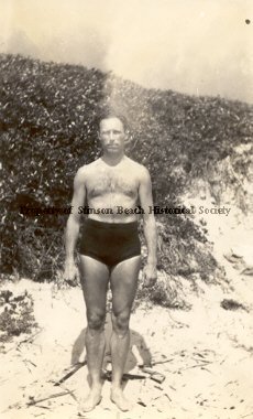 In this black and white photograph a man (Ralph Sterner) stands on a sand dune facing the camera. He is wearing a bathing suit and is bare chested. There is vegetation growing on the dune behind him. The photograph has a light streak going from his face to the top of the picture.