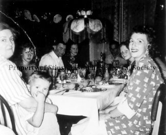 This black and white photo is of eight people sitting around a dining table. The table is laden with plates of food and stem ware. The lady on the left, closest to the camera is looking toward the camera over her right shoulder. She has her right arm around a little boy standing next to her. She is Dorothy Thomsen and the boy is Greg Sherfey. The rest of the people are unidentified. The lady on the right is wearing a print shirt. The rest of the people are farther from the light source and less prominent.
